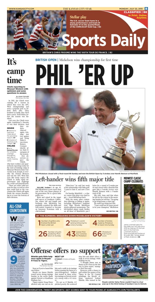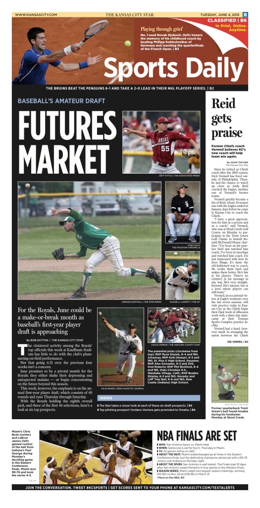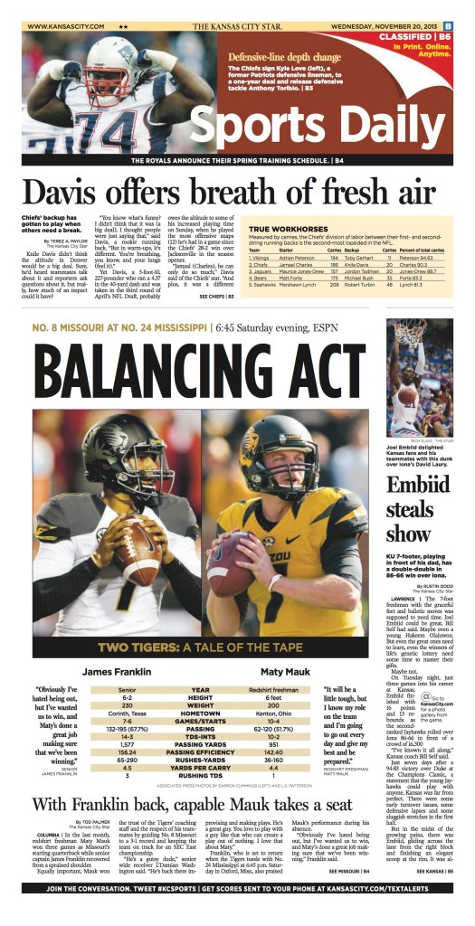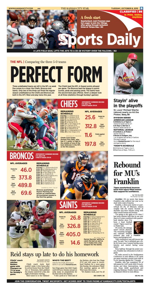 I’VE BEEN FORTUNATE TO HAVE OPPORTUNITIES TO DESIGN on tight nightly deadlines in fast-paced newsrooms. Here you’ll find a handful of my favorite sports fronts from the Kansas City Star and a special section from the Columbia Missourian.