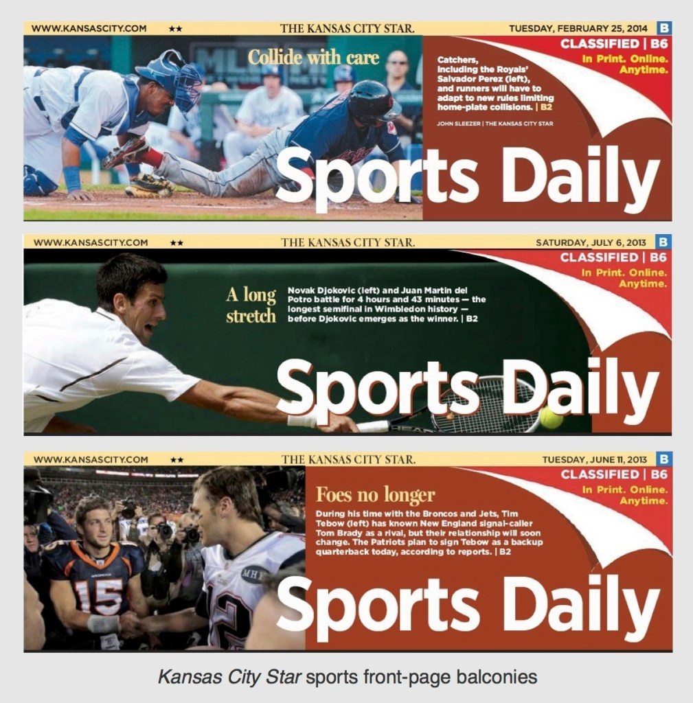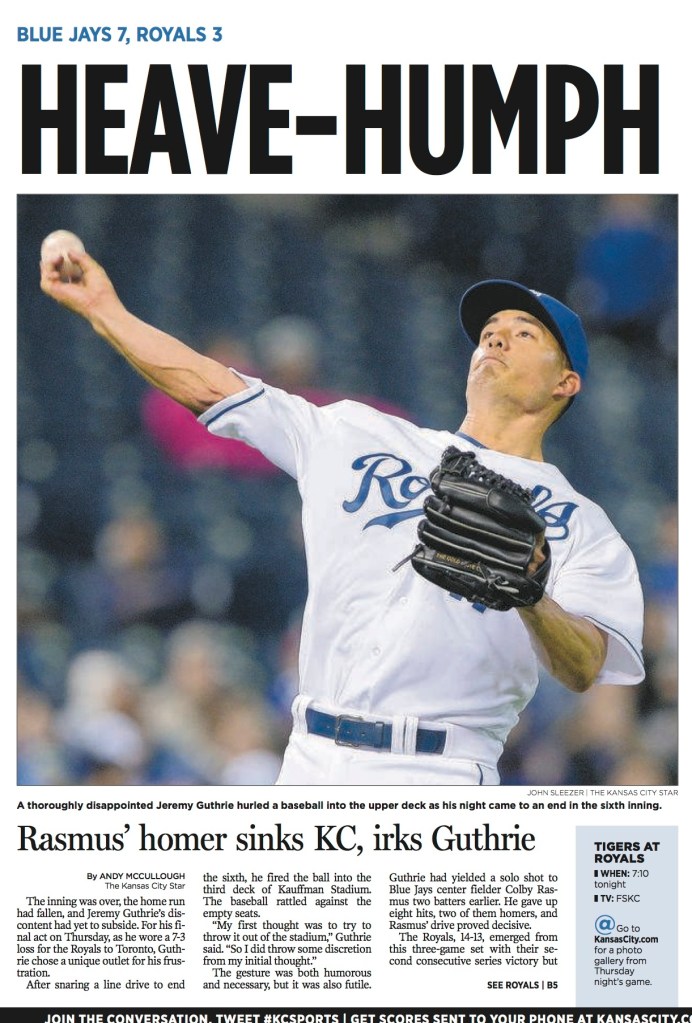 After designing these sports section front pages, I came up with hammer headlines that tied together the photos and stories. On the left is a frustrated pitcher who threw a ball into the stands. On the right is a play on Missouri’s nickname for a Royals-Cardinals game.