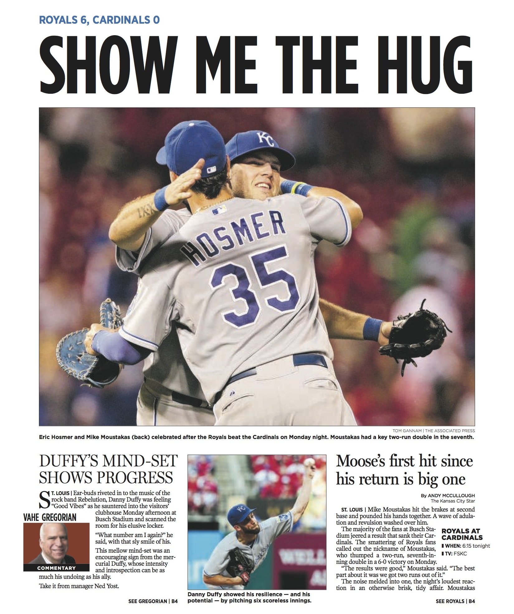 After designing these sports section front pages, I came up with hammer headlines that tied together the photos and stories. On the left is a frustrated pitcher who threw a ball into the stands. On the right is a play on Missouri’s nickname for a Royals-Cardinals game.
